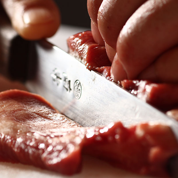 喜助の中でも数人しかいない熟練した職人が仕込み、じっくりと時間をかけて熟成、牛たん専門店 味の牛たん喜助ならではの逸品牛たんです。厳選した産地の牛たんをさらに吟味し、約1センチのダイナミックなボリュームでスライス。丁寧に1枚ずつ切り込みを入れ、風味の良い赤穂のしおを手振りで味付けし、じっくりと熟成させます。この熟練の技が、焼き上げた時に、さくっとしてジューシーな、喜助ならではの牛たんに仕上げます。品質の良い、厳選した牛たんだからこそできる、手振りでの味付け。これこそが、喜助の牛たんの真髄です。