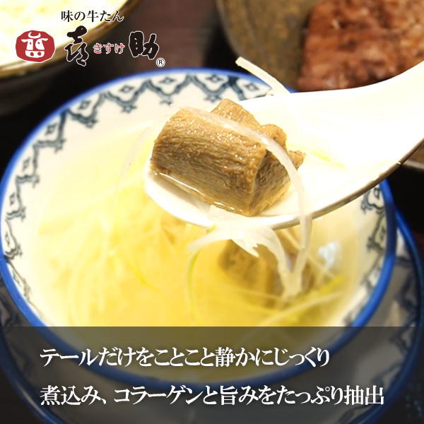 喜助のテールスープは、テールだけをことこと静かにじっくり煮込み、コラーゲンと旨みをたっぷり抽出。大きめの牛たんもゴロゴロっと入っていますので、温めて長ネギの千切りを添えて頂くと、お店のテールスープと同じ美味しさです。鍋やおでん、うどん、雑炊などのスープにもぴったりですよ!