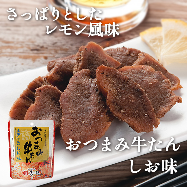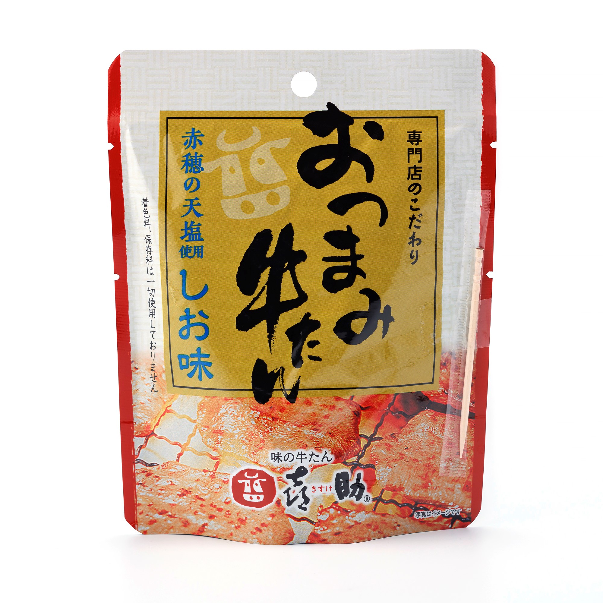 牛たんを柔らかくじっくりとゆで上げ、うま味と風味のある赤穂の塩で味付けしました。そのままパクッとお召しあがり頂けます。お酒のおつまみやおやつに、行楽のお供にピッタリ。爪楊枝付き。
