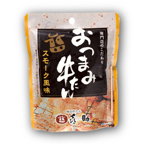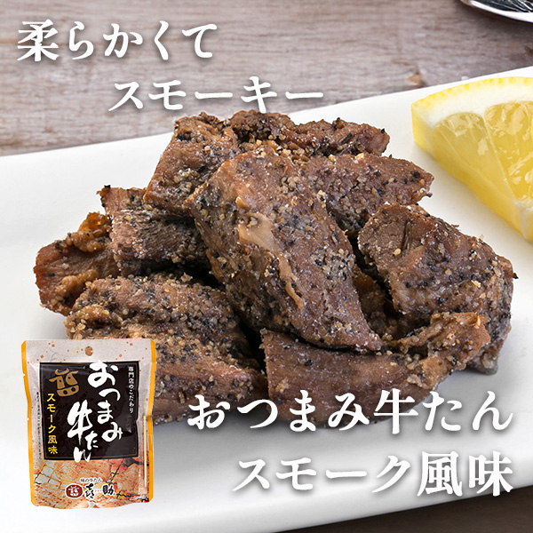 柔らかい部位の牛たんを食感にこだわった調理法でつくりました。スモーク風味の味わいです。そのままパクッとお召しあがり頂けます。お酒のおつまみやおやつに、行楽のお供にピッタリ。爪楊枝付き。
