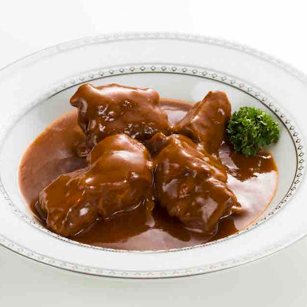 【原材料名】牛たん加工品(国内製造)、トマトペースト、小麦粉、ビーフ風味調味料、ラード、ワイン、砂糖、たまねぎ風味調味料、精製はちみつ、たん白加水分解物、酵母エキス、でん粉、バター、食塩、香辛料/調味料(アミノ酸等)、(原材料の一部に乳成分・小麦・牛肉・大豆・豚肉を含む)