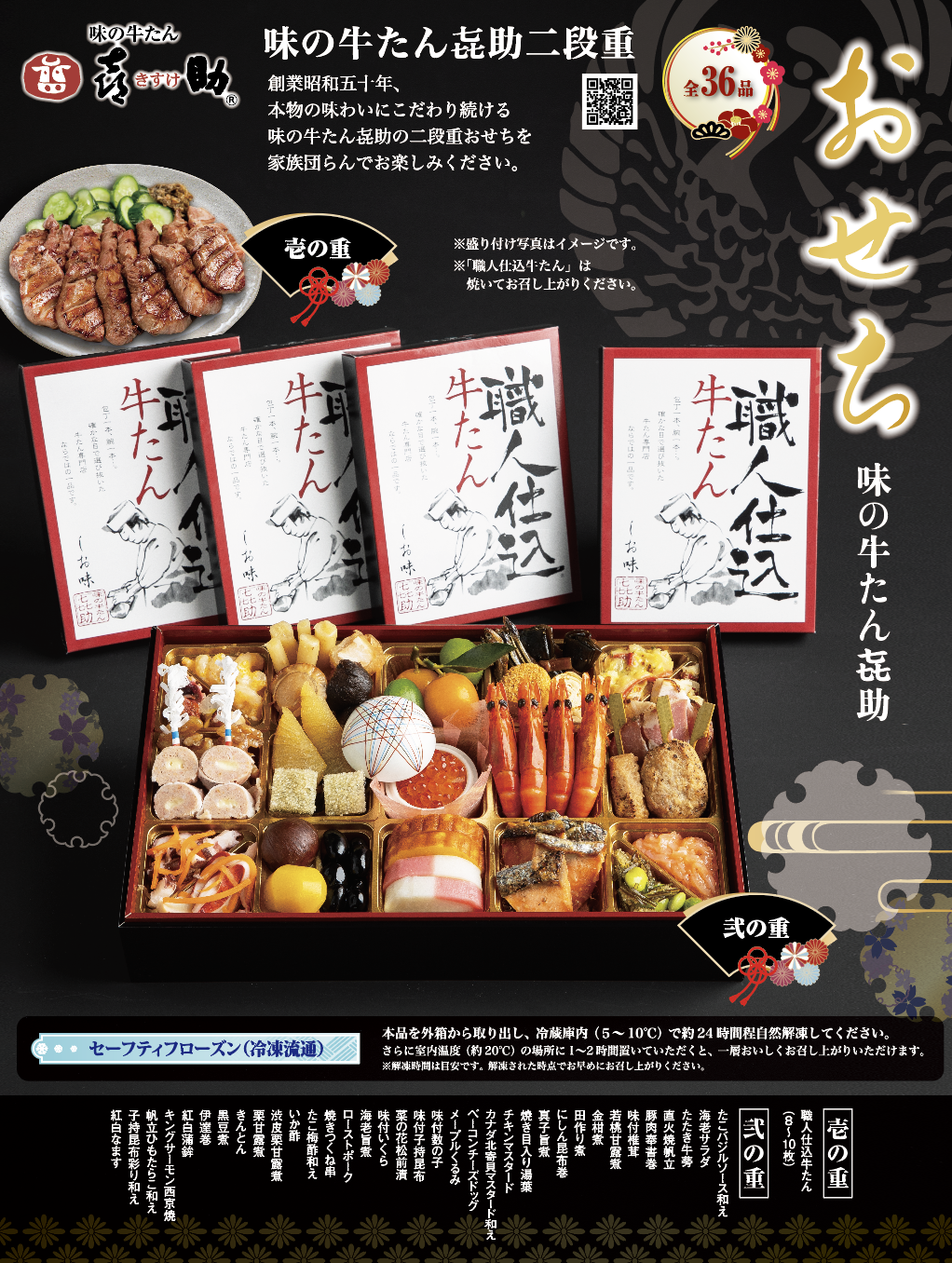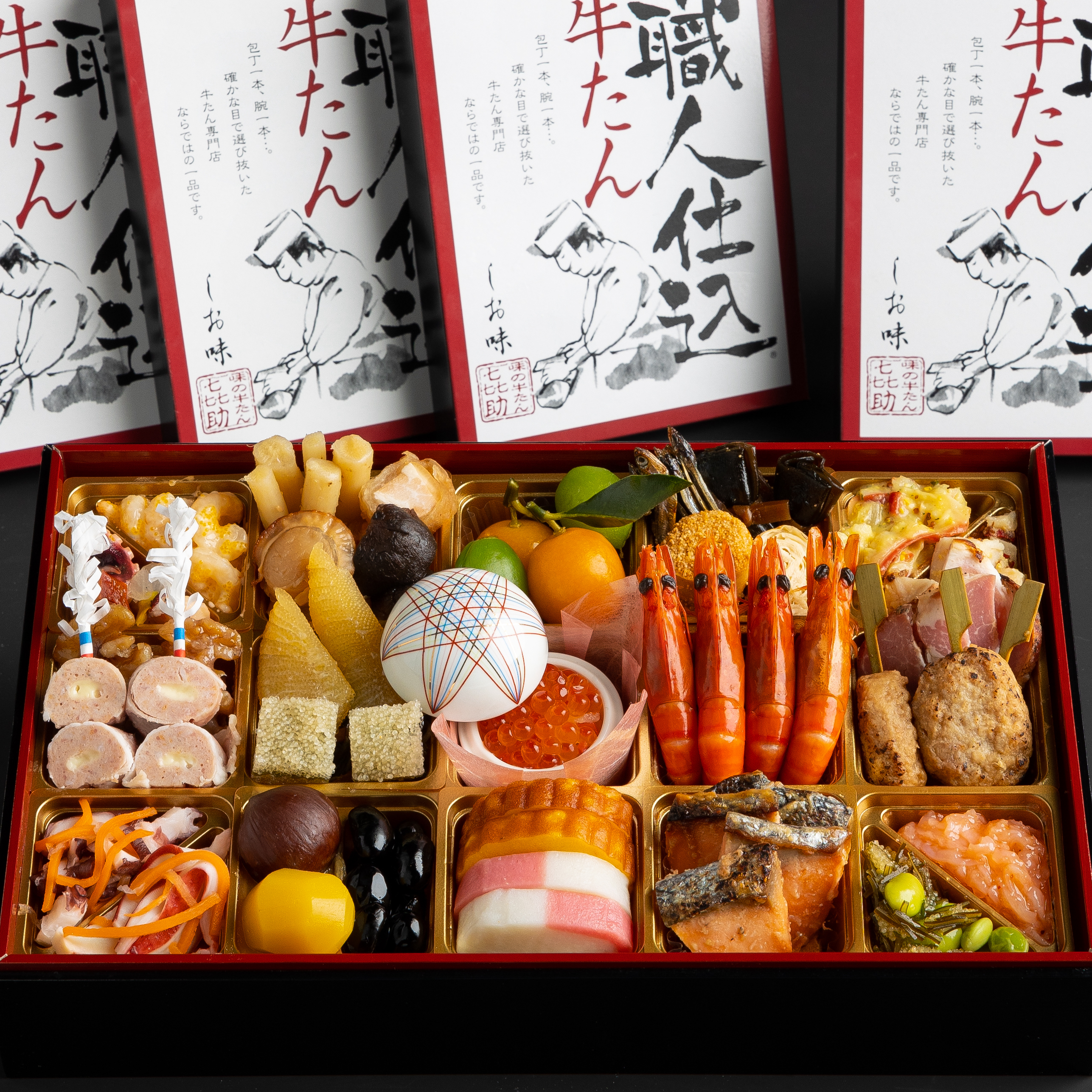 味の牛たん喜助の人気No.1「職人仕込牛たん しお味(4箱)」と、36品の豪華おせちをセットにした特別な限定品です。