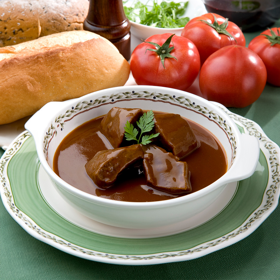 【原材料名】牛たん、たまねぎペースト、フォンドボー、小麦粉、りんごピューレー、砂糖、植物油脂、トマトペースト、トマトケチャップ、酵母エキス、たん白加水分解物、ビーフエキス、クリーム(乳製品)、バター、ワイン調整品、でん粉、香辛料、ワイン、pH調整剤、トレハロース、(原材料の一部に大豆、豚肉を含む)