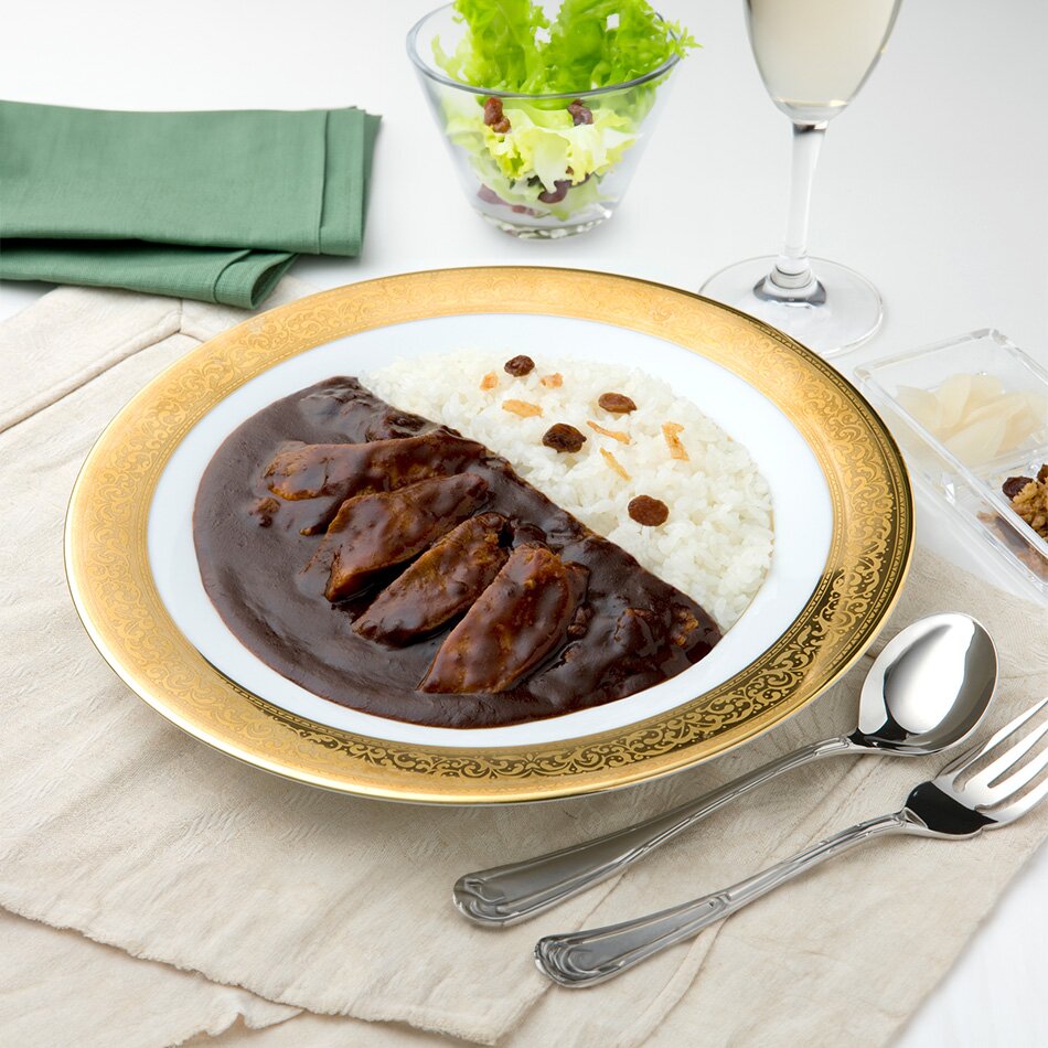 【原材料名】牛たん、小麦粉、動物油脂、炒めたまねぎ、トマトペースト、りんごピューレー、ビーフエキス、砂糖、カレー粉、酵母エキス、チャツネ、しょうが、ミルポワペースト、精製はちみつ、バター、食塩、にんにくペースト、香辛料、ワイン、カラメル色素、増粘剤(加工デンプン)、酸味料、PH調整剤、トレハロース、(原材料の 一部に鶏肉、豚肉を含む)